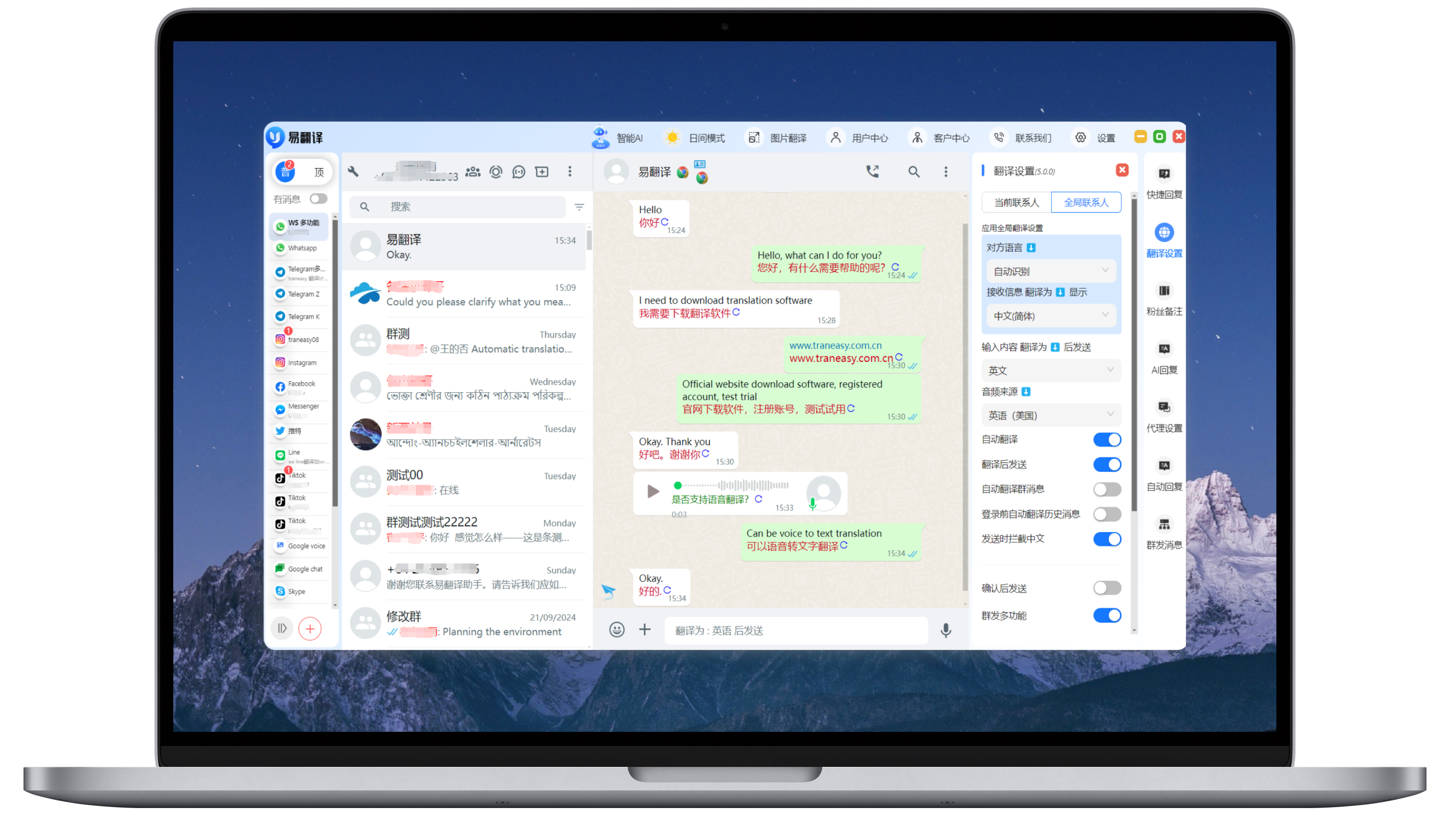 支持全球主流社交通讯软件在线实时精准翻译(可多开)支持全球200+语种。